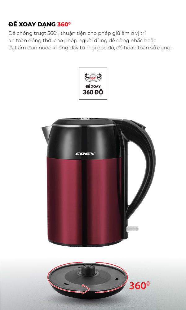 Thân ấm xoay 360 độ linh hoạt trên đế tiếp điện Đế tiếp điện được thiết kế độc lập, tách rời khỏi thân ấm, giúp việc đổ nước – tiếp nước dễ dàng, linh hoạt. Ấm có thể xoay 360 độ trên đế tiếp điện, người dùng có thể đặt ấm lên hay nhấc ấm ra khỏi đế ở bất cứ góc nào mà không phải lo lắng đến vấn đề phải đặt sao cho khớp.