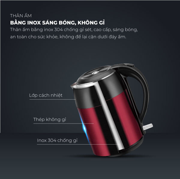 Mẫu mã đơn giản, tinh tế, tiện dụng Thân ấm bằng inox sáng bóng, không gỉ Thân ấm bằng inox 304 chống gỉ sét, cao cấp, sáng bóng, an toàn cho sức khỏe, không để lại cặn dưới đáy ấm sau thời gian dài sử dụng.