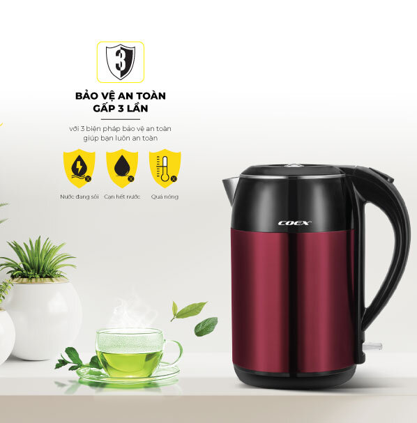 Chế độ an toàn Ấm siêu tốc trang bị cảm biến hơi nước, chống đun sôi khô và quá nóng. Ngoài ra ấm siêu tốc Coex còn có chế độ ngắt tự động khi nước sôi hoặc cạn nước, đảm bảo an toàn tối đa cho người sử dụng (quên/bận rộn công việc khác). Chức năng này còn giúp làm tăng tuổi thọ sản phẩm và phòng chống cháy nổ.