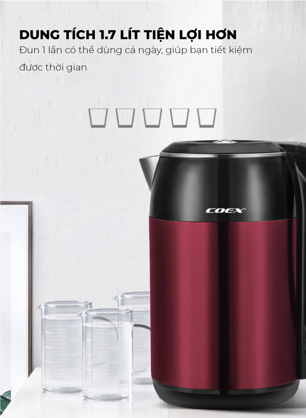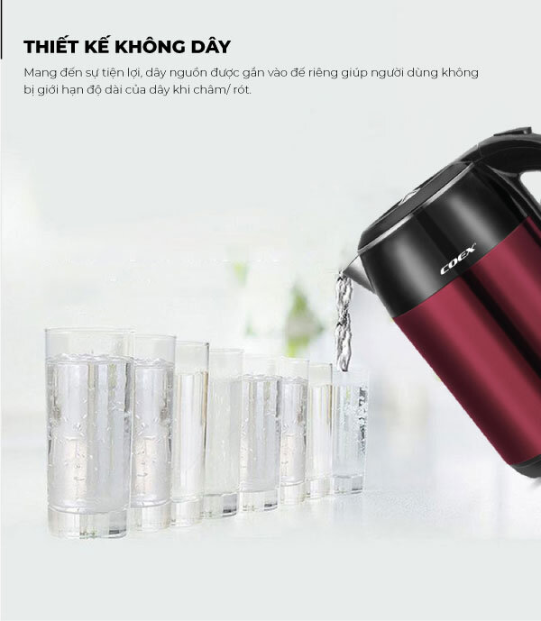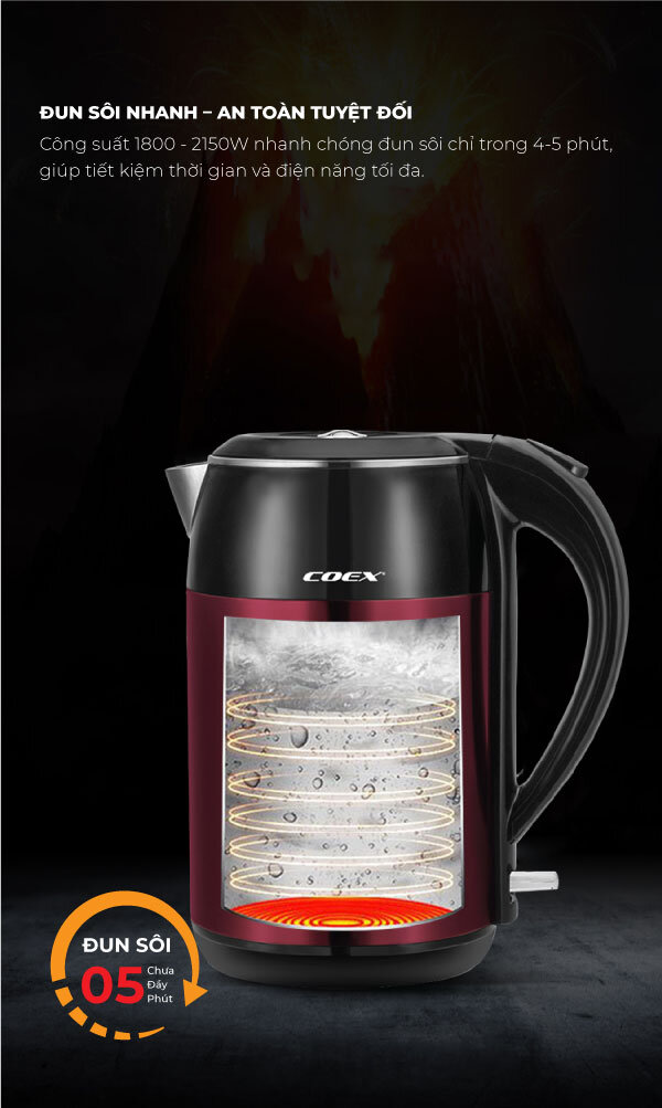 Đun sôi nhanh – An toàn tuyệt đối Tiết kiệm điện năng Ấm siêu tốc Coex có dung tích 1.7L, Công suất: 1800 - 2150W nhanh chóng đun sôi chỉ trong 4-5 phút, giúp tiết kiệm thời gian và điện năng tối đa.