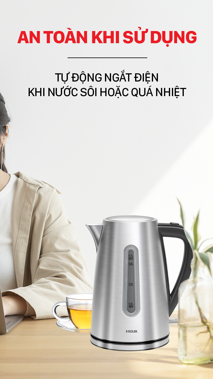 Ấm đun siêu tốc Roler sẽ tự động ngắt điện khi nước sôi hoặc quá nhiệt, đảm bảo an toàn cho nguồn điện, phòng chống cháy nổ, nên bạn hoàn toàn yên tâm khi sử dụng.