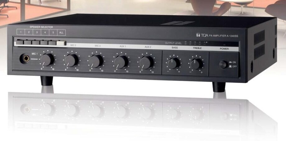 - Amply Mixer TOA A-1240SS AS kèm bộ chọn 5 vùng loa Có 3 ngõ vào cân bằng điện tử cho Micro, 2 ngõ vào AUX và một đường ra tiền khuếc đại. Đầu ra loa có cầu đấu cho loa trở kháng cao (70V hoặc 100V) và trở kháng thấp (4Ω). Chức năng tắt tiếng chp phép MIC 1 được ưu tiên. Điều chỉnh âm sắc hiệu quả cả 2 âm bass và treble. Cho phép gọi 5 vùng riêng biệt hoặc gọi tất cả vùng ( chỉ có A-1240SS AS – A-1360SS AS)