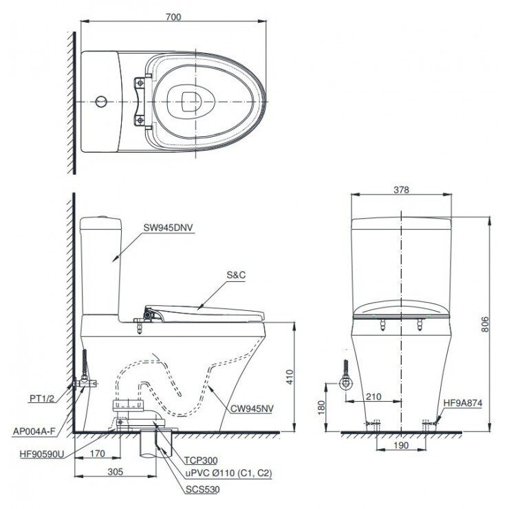 Bản vẽ kỹ thuật bồn cầu 2 khối nắp rửa điện tử TOTO CS945DNW11