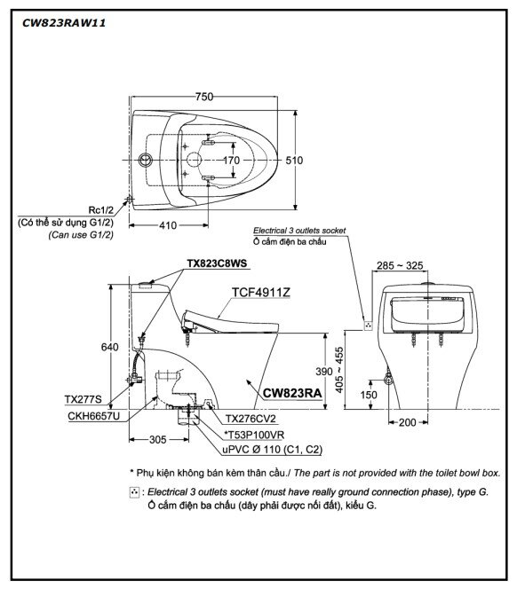 Bản vẽ kỹ thuật bồn cầu 1 khối nắp rửa điện tử S7 TOTO CW823RAW11/T53P100VR
