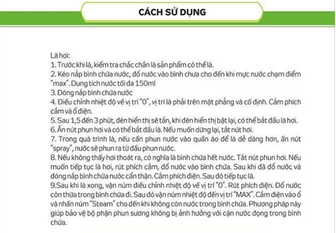 1. Đặc tính sản phẩm: • Hoạt động với công suất mạnh mẽ 1.200W tạo lực hơi nước lớn: Công suất hoạt động 1.200W sản sinh ra lượng hơi nước với áp suất mạnh và hơi nóng cao giúp ủi thẳng nhanh chóng các vết nhăn trên bề mặt vải. • Mặt đế kép chống dính Teflon chống trầy xước lướt nhẹ nhàng trên vải: Mặt đế kép chống dính Teflon chống trầy xước giúp bàn ủi lướt êm trên bề mặt các loại vải, không làm quần áo bị hư hỏng. • Thiết kế mũi ủi nhọn ủi dễ dàng vết nhăn vùng khó ủi: Thiết kế với mũi ủi nhọn giúp dễ dàng tiến sâu ủi thẳng vết nhăn những vùng khó ủi gây khó khăn trong quá trình ủi như dọc theo hàng cúc, cổ hay tay áo. • Kiểu dáng nhỏ gọn, màu sắc hiện đại: Lớp vỏ bàn ủi được phủ màu sắc hiện đại kết hợp hài hòa giữa đỏ và trắng, các nút chức năng được phân bố đồng đều thuận tiện thao tác khi sử dụng. • Chức năng phun sương, phun hơi hiệu quả: Chức năng phun hơi làm ẩm mịn mặt vải nhanh chóng, lỗ thoát hơi được phân bố hợp lý trên mặt đế giúp hơi nước được dàn trải đồng đều trên mặt vải làm các vết nhăn được ủi thẳng dễ dàng. • Quần áo được bảo vệ an toàn với vòng chỉnh nhiệt sử dụng dễ dàng: Vòng chỉnh nhiệt được thiết kế vừa vặn có thể điều chỉnh nhiệt độ phù hợp cho từng loại vải một cách dễ dàng và chính xác nhằm bảo vệ quần áo khỏi tình trạng bị cháy xém gây hư hỏng. • Chức năng tự ngắt khi quá nhiệt, an toàn khi sử dụng: Chức năng tự ngắt khi quá nhiệt sẽ bảo vệ an toàn tuyệt đối cho người sử dụng. • Tiết kiệm thời gian vệ sinh với chứa năng tự làm sạch: Chức năng tự làm sạch sẽ giúp người sử dụng tiết kiệm tối đa thời gian để vệ sinh sản phẩm. • Chức năng là khô • Hiển thị mực nước