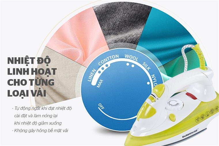 Tùy chỉnh lượng nước/hơi nước thoát ra linh hoạt bằng thanh gạt phía trên. Gạt về vạch 0 nếu bạn đang sử dụng chức năng là khô hoặc không muốn nước/hơi nước thoát ra liên tục. Với vạch MAX và chế độ phun hơi, lượng nước thoát ra trên bề mặt là nhiều và liên tục, nên chọn mức nhiệt độ cao nhất khi sử dụng để bề mặt là đủ nóng biến nước thành hơi nước, tránh hiện tượng rò rỉ. Cảm biến nhiệt đóng ngắt an toàn An tâm hoàn toàn khi sử dụng bàn là hơi SUNHOUSE vì được trang bị cảm biến nhiệt an toàn, tự động đóng ngắt khi quá tải nhiệt. Bàn là sẽ tự ngắt khi đạt đến nhiệt độ lý tưởng (phù hợp với các loại vải khác nhau).