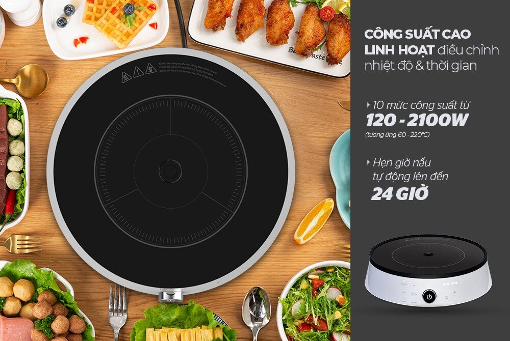 Sản phẩm được tích hợp sẵn 6 chức năng nấu nướng (lẩu, cháo, xào, hầm…) và 10 mức gia nhiệt linh hoạt (từ 120 – 2100W), cho bạn tùy chỉnh linh hoat theo mong muốn sử dụng.Chức năng hẹn giờ giúp bạn lựa chọn thời gian nấu nướng phù hợp với từng món ăn (từ 0 – 24 giờ). Bạn sẽ có thêm nhiều thời gian để tranh thủ chuẩn bị món ăn khác hoặc thực hiện công việc nội trợ, dọn dẹp nhà cửa.Tặng kèm bếp là một nồi lẩu đáy từ dày dặn, lòng nồi phủ chống dính cao cấp. Phụ kiện dùng được như nồi lẩu hoặc chảo chống dính khi chiên xào… , vô cùng tiện lợi cho cả gia đình quây quần dịp lễ lạt, cuối tuần… An toàn cho người sử dụng