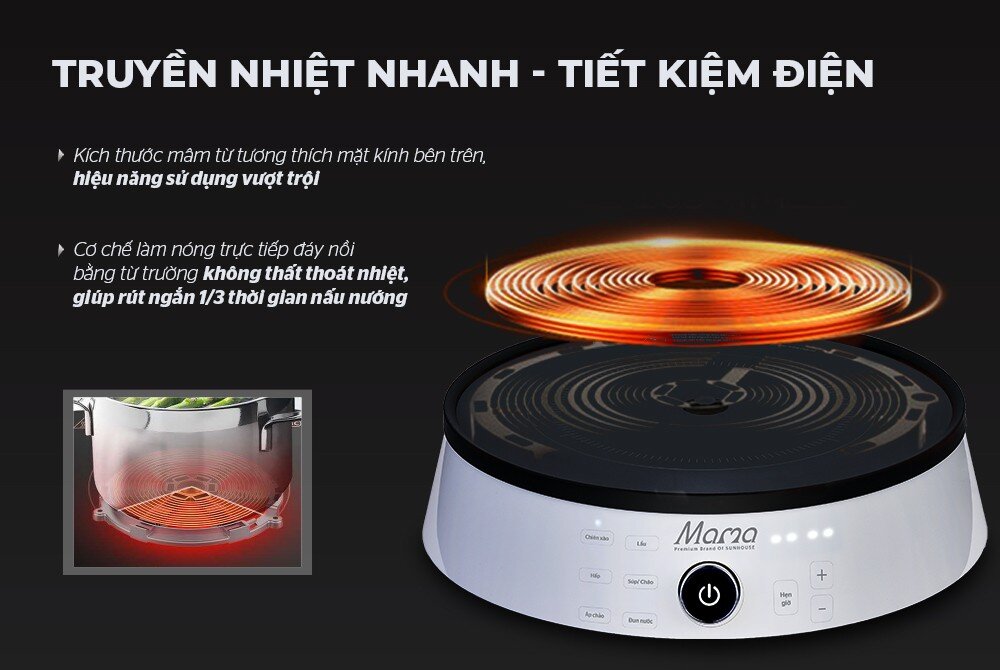Bảng điều khiển hiện đại, dễ sử dụngSản phẩm được điều khiển kết hợp giữa nút ấn cảm ứng và núm xoay cơ học. Chỉ cầm chạm nhẹ là hoạt động theo yêu cầu, dễ dàng sử dụng.Hệ thống bảng hiển thị được làm bằng đèn LED và tích hợp ngay trên than bếp giúp cho người sử dụng có thể quan sát một cách dễ dàng mức nhiệt độ của bếp. ĐA DẠNG CHỨC NĂNG – SỬ DỤNG AN TOÀNTỏa nhiệt đều, nấu nướng nhanhBếp từ đơn SUNHOUSE MAMA SHD6885 có công suất cao 2100W giúp quá trình gia nhiệt diễn ra nhanh hơn. Cơ chế làm nóng trực tiếp đáy nồi bằng từ trường và nhiệt năng chỉ tập trung vào vùng cần nấu chín giúp thực phẩm chín nhanh, rút ngắn thời gian nấu nướng. Đa dạng công năng & tiện ích