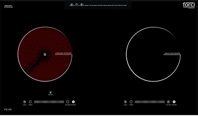 - Bếp từ đôi ForCi FC-F9 với hai mâm từ tự động nhận biết kích cỡ xoong nồi và nhận biết chất liệu của xoong nồi