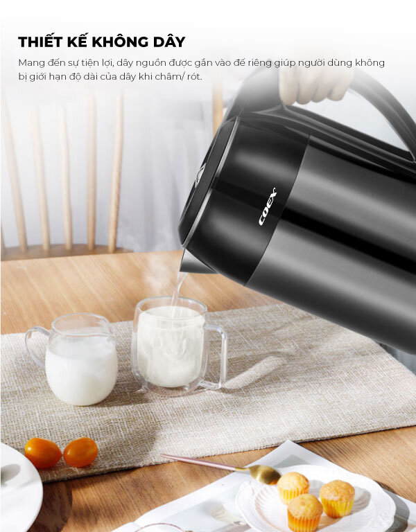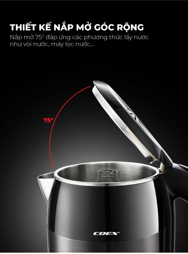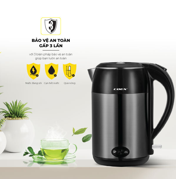 Chế độ an toàn Ấm siêu tốc trang bị cảm biến hơi nước, chống đun sôi khô và quá nóng. Ngoài ra ấm siêu tốc Coex còn có chế độ ngắt tự động khi nước sôi hoặc cạn nước, đảm bảo an toàn tối đa cho người sử dụng (quên/bận rộn công việc khác). Chức năng này còn giúp làm tăng tuổi thọ sản phẩm và phòng chống cháy nổ.