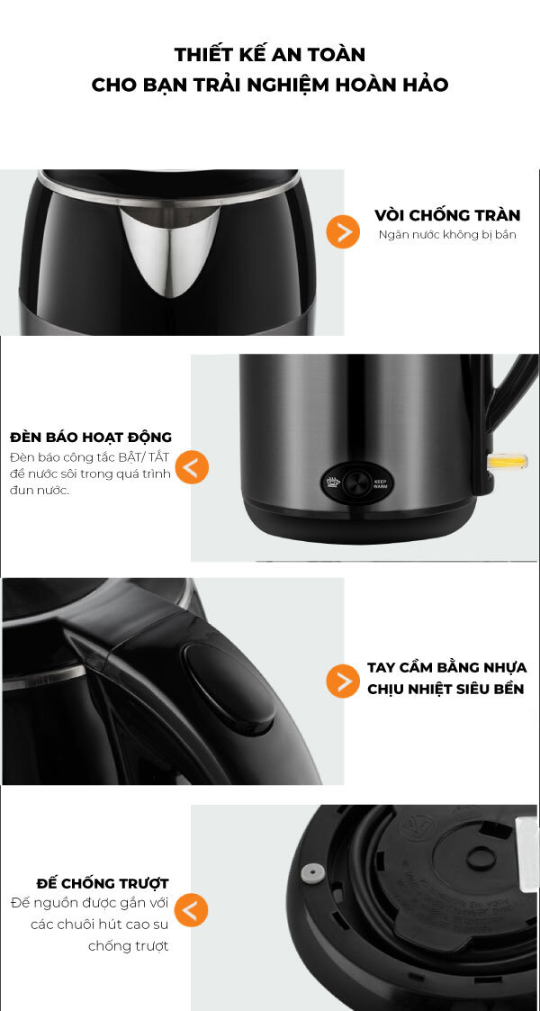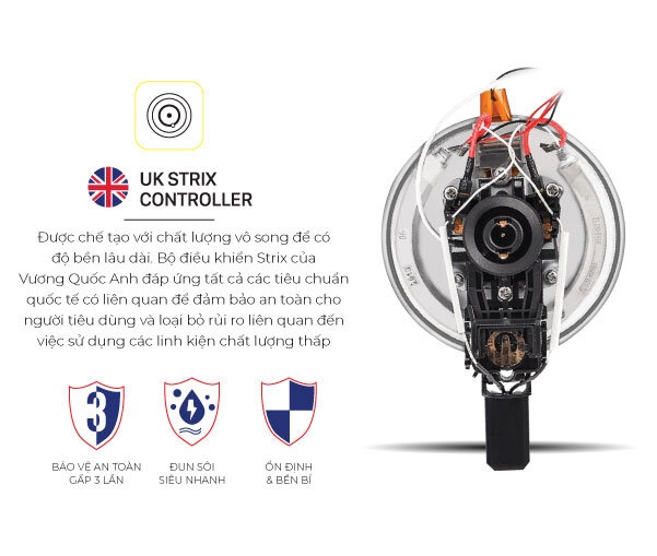 Thân ấm xoay 360 độ linh hoạt trên đế tiếp điện Đế tiếp điện được thiết kế độc lập, tách rời khỏi thân ấm, giúp việc đổ nước – tiếp nước dễ dàng, linh hoạt. Ấm có thể xoay 360 độ trên đế tiếp điện, người dùng có thể đặt ấm lên hay nhấc ấm ra khỏi đế ở bất cứ góc nào mà không phải lo lắng đến vấn đề phải đặt sao cho khớp. Bộ điều khiển STRIX (Anh Quốc) đem đến sự chất lượng và tuổi thọ cao.