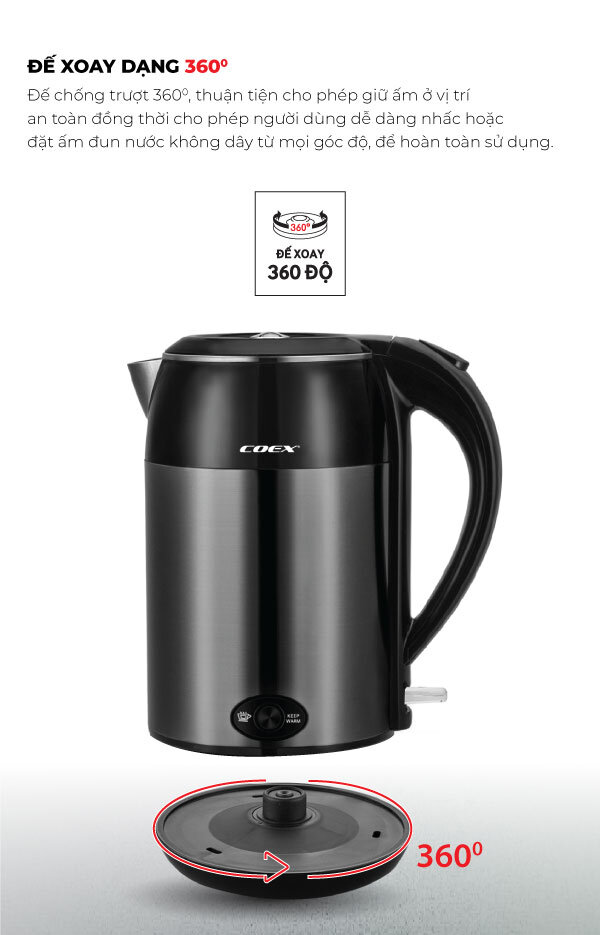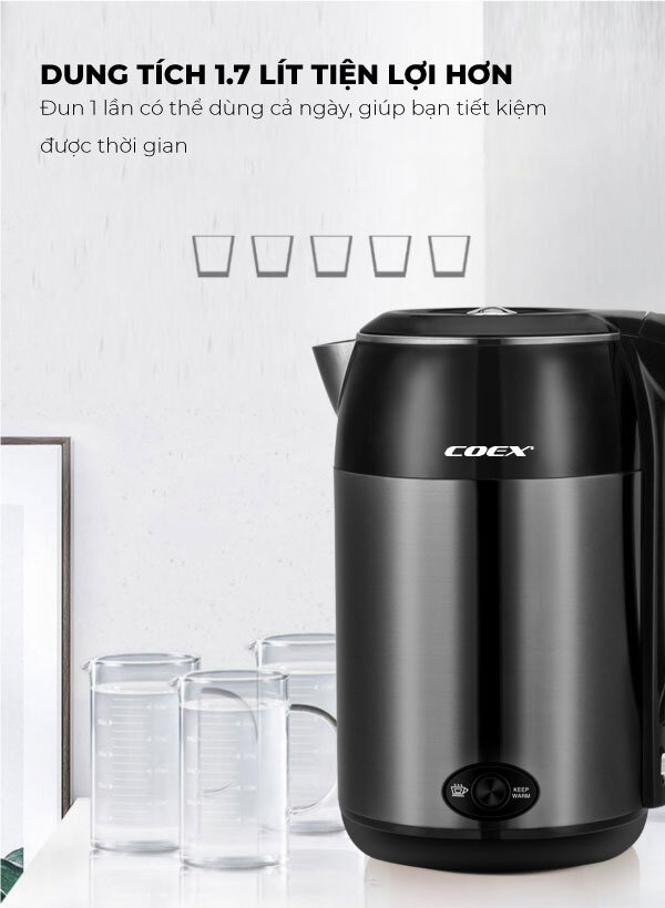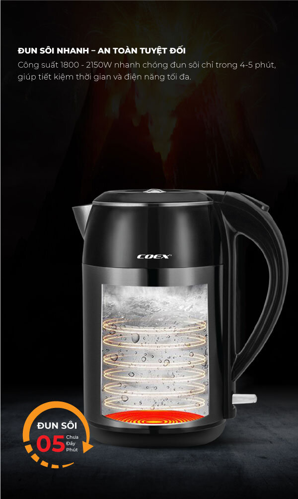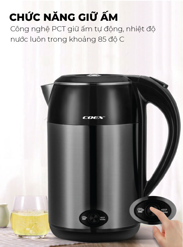 Đun sôi nhanh – An toàn tuyệt đối Tiết kiệm điện năng Ấm siêu tốc Coex có dung tích 1.7L, Công suất: 1800 - 2150W nhanh chóng đun sôi chỉ trong 4-5 phút, giúp tiết kiệm thời gian và điện năng tối đa. Công nghệ PCT giữ ấm tự động, nhiệt độ nước luôn trong khoảng 85 độ C.