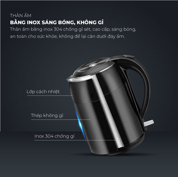 Mẫu mã đơn giản, tinh tế, tiện dụng Thân ấm bằng inox sáng bóng, không gỉ Thân ấm bằng inox 304 chống gỉ sét, cao cấp, sáng bóng, an toàn cho sức khỏe, không để lại cặn dưới đáy ấm sau thời gian dài sử dụng.