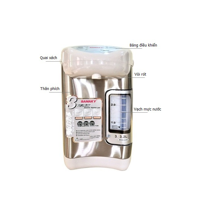 Phích điện Sanaky AT-32N Phích điện Sanaky AT-32N là 1 sản phẩm phích đun nước nóng bằng điện trong dòng sản phẩm phích điện của Sanaky. Với dung tích 3.2 lít, tốc độ đun nước nóng nhanh, giữ nóng ở nhiều mức độ khác nhau, chế độ hoạt động tự động với chương trình cài đặt sẵn, chống quá nhiệt, chống cạn nước, có vạch hiển thị mực nước,... phích điện phù hợp với gia đình, văn phòng, nhà hàng, quán cafe,...