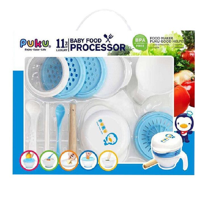Giai đoạn bé bắt đầu ăn dặm là giai đoạn mẹ cần phải chuẩn bị thực đơn bữa ăn cho bé mỗi ngày, điều này khiến các mẹ mất khá nhiều thời gian cùng như công sức nếu như không được hỗ trợ bằng các dụng cụ thích hợp. Bộ Chế Biến Đồ Ăn Dặm 11 Món Puku bao gồm 11 dụng cụ hữu ích như chày, cối, bàn mài,...được làm từ chất liệu nhựa cao cấp, an toàn, có độ bền đẹp cao sẽ là sản phẩm hữu ích giúp mẹ chuẩn bị bữa ăn cho bé một cách nhanh chóng và thuận tiện hơn. Sản phẩm hiện đã có mặt tại Hasaki với mức giá hợp lý.