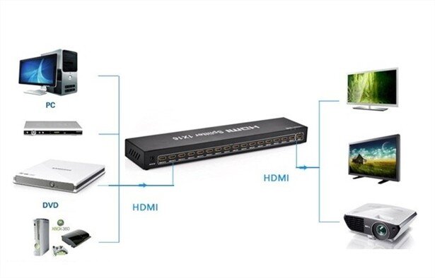 Bộ chia hdmi 1 ra 16 cổng hỗ trợ full HD 1080p chính hãng Ugreen 40218sử dụng 1 máy tính, đầu ghi hình camera, đầu kĩ thuật số... xuất ra 16 màn hình hoặc máy chiếu có hình ảnh giống nhau. Bộ chia HDMI 16 cổng được sử dụng trong siêu thị, hội trường, ngân hàng, nhà máy, trung tâm điều kiển giao thông, đài truyền hình, trường học.... Thông tin sản phẩm bộ chia cổng HDMI 1x16 HDMI Splitter Ugreen 40218 Bộ chia HDMI 1 ra 16 cổng Ugreen hỗ trợ full HD 1080p sử dụng một nguồn HDMI duy nhất, tiếp cận nhiều bồn HDMI. Nó cho phép một thiết bị HDMI được phân chia một cách dễ dàng với các màn hình tương thích mười sáu HDMI hoặc máy chiếu. Các Splitter cũng có thể được đặt ở phần cuối của một cáp HDMI dài để tái tạo HDMI signal.Resolution lên đến 1080p/ 30Hz. Tính năng : Bộ chia HDMI 1x16 cổng chính hãng Ugreen 40218 * Một trong những tín hiệu đầu vào HDMI 1.3b chia đến mười sáu HDMI thiết bị tản 1.3b * HDCP 1.2 giao thức tuân thủ * Hỗ trợ CEC * Hỗ trợ màu trầm 30bit, 36bit * Hỗ trợ Blue-Ray 24/50 / 60fs / HD-DVD / xvYCC * Định dạng âm thanh kỹ thuật số, như DTS-HD / Dolby-TrueHD / LPCM7.1 / DTS / Dolby-AC3 / DSD * Hỗ trợ tín hiệu retiming * Hỗ trợ đầu vào lên đến 15met AWG26 HDMI 1.3 dài cáp tiêu chuẩn, Đầu ra hdmi lên đến 25m. * Không mất chất lượng hình ảnh * Cài đặt trong vài phút, chỉ cần cắm là sử dụng. * Cần DC 5-12V cung cấp điện