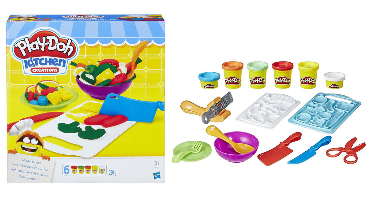 - Khuôn Tạo Hình Rau Củ Nhà Bếp Play Doh gồm có 2 chiếc thớt, nhiều khuôn tạo hình rau củ và 6 hộp bột nặn và nhiều dụng cụ làm bếp như: dao, muỗng, nĩa, kéo, chén… cho bé dễ dàng làm thanh một món ăn hấp dẫn cho bạn bè.
