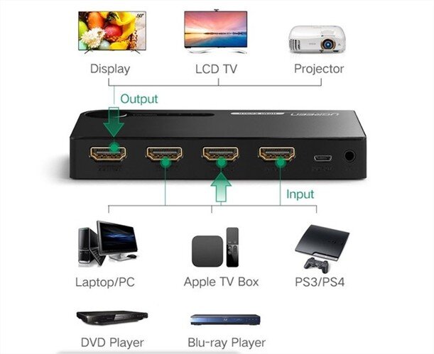 Mô tả : Bộ chuyển mạch HDMI 3x1 hỗ trợ full HD 1080p chính hãng Ugreen UG-40234 - UGREEN UG-40234 3x1 HDMI Switch cung cấp một cách để chuyển đổi giữa nhiều tín hiệu HDMI đến một đầu ra duy nhất. Nó cho phép chuyển đổi của ba yếu tố đầu vào và duy trì tất cả các thành phần tín hiệu hiện tại trong mã hóa tín hiệu HDCP mã hóa. Nó cho phép người dùng dễ dàng lựa chọn từ các nguồn chương trình khác nhau mà không cần di chuyển cáp xung quanh.