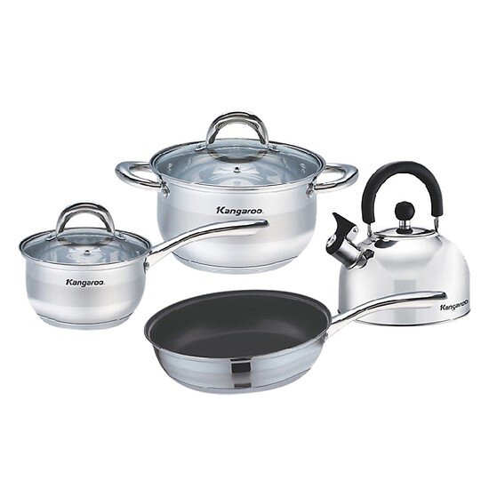 Bộ nồi, chảo, ấm inox Kangaroo KG998M gồm 4 món: 1 nồi canh 24cm, 1 nồi 1 tay cầm 16cm phù hợp quấy bột hoặc cháo cho bé hay nấu các món ăn với số lượng ít, 1 quánh 24cm và 1 ấm đun nước dung tích 2.5L. Phù hợp với tất cả các loại bếp: bếp gas, bếp hồng ngoại, bếp từ.
