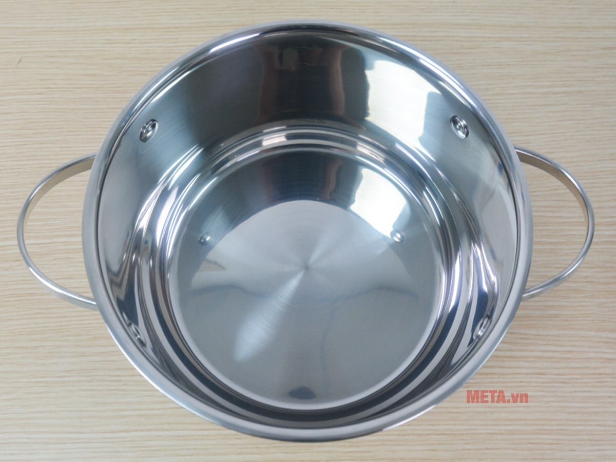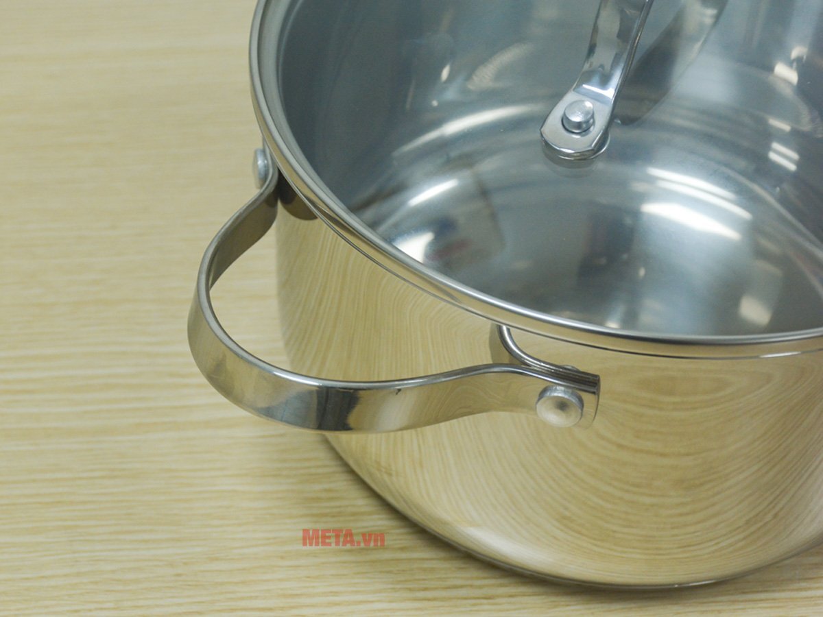 2 quai nồi được tán đinh chắc chắn với thân nồi giúp tăng tính bền bỉ và tuổi thọ của quai nồi. Quai nồi đinh tán có khả năng chịu được sự va đập, rung động và sử dụng lâu dài mà không dễ bị rụng hay hỏng hóc.