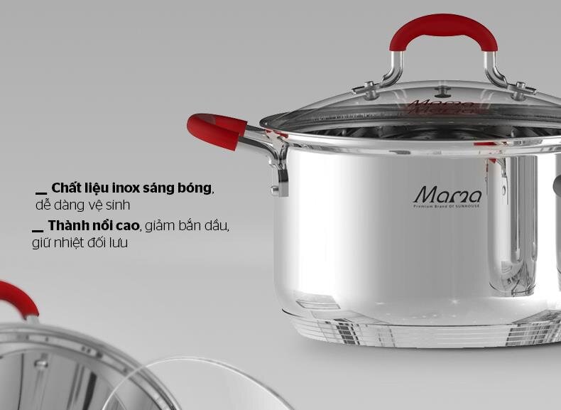 Thân nồi được làm bằng inox cao cấp Chất liệu inox cao cấp giúp cho sáng bóng, dễ dàng lau rửa, vệ sinh sau mỗi lần sử dụng. Thành nồi dày dặn, hạn chế móp méo nếu chẳng may làm rơi. Kiểu dáng của bộ nồi sang trọng, góp phần tạo nên vẻ hiện đại, tinh tế cho không gian nhà bếp của bạn.