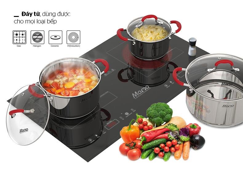 Đáy nồi tỏa nhiệt đều, giữ nhiệt tốt Bộ nồi có cấu tạo đáy 5 lớp truyền nhiệt nhanh, tỏa nhiệt đều và giữ nhiệt tốt nên rất tiết kiệm nhiên liệu cũng như thời gian nấu nướng. Đặc biệt, sản phẩm hạn chế cháy khét thực phẩm giúp bạn nấu nướng thuận tiện hơn.