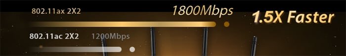 Router Wifi cung cấp băng thông 80MHz và 1024-QAM cho kết nối không dây nhanh hơn rõ rệt với tổng tốc độ mạng khoảng 1800Mbps - 574Mbps trên băng tần 2.4GHz và 1201Mbps trên băng tần 5GHz giúp nhanh hơn 1,5 lần so với băng tần chuẩn 802.11ac.