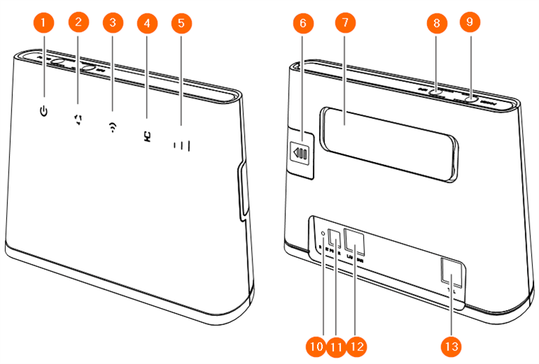 1. Đèn báo nguồn. 2. Chế độ mạng: Xanh dương (4G), Tím (3G), Vàng (2G), Màu xanh lá cây (Cáp Ethernet ), Màu đỏ (Không nhận thẻ sim (Sim hỏng, ngoài vùng phủ song, sai mã Pin….). 3. Chế độ wifi: Ánh sáng cố định (Wifi On), Chế độ WPS, Ánh sáng tắt (Wifi tắt). 4. Chế độ mạng Lan/Wan: Ánh sáng cố định (Kết nối), Ánh sáng nhấp nháy (Gửi và nhận dữ liệu), Ánh sáng tắt (Ngắt kết nối). 5. Chế độ mạng: Đèn sáng (Có mạng), Đèn tắt (Không có mạng). 6. Khe cắm sim. 7. Đầu nối ăng ten ngoài (Mua ngoài không kèm sản phẩm). 8. Nút WPS: Kích hoạt chế độ WPS (Nhấn giữ trong vòng 2s hoặc hơn cho đến khi đèn 3 nhấp nháy). 9. Nút power: Nhấn và giữ khoảng 3s để bật hoặc tắt bộ phát. 10. Nút reset (Nhấn và giữ trong khoảng 3s cho đến khi đèn 2 nhấp nháy). 11. Nguồn cung cấp (12v – 1A). 12. Cổng Lan/Wan (Kết nối thiết bị của cáp Ethernet). 13. Cổng kết nối điện thoại.
