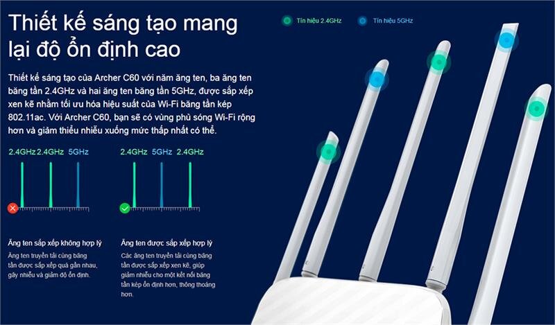 Thiết kế sáng tạo của Archer C60 với năm ăng ten, ba ăng ten băng tần 2.4GHz và hai ăng ten băng tần 5GHz, được sắp xếp xen kẽ nhằm tối ưu hóa hiệu suất của Wi-Fi băng tần kép 802.11ac. Với Archer C60, bạn sẽ có vùng phủ sóng Wi-Fi rộng hơn và giảm thiểu nhiễu xuống mức thấp nhất có thể.