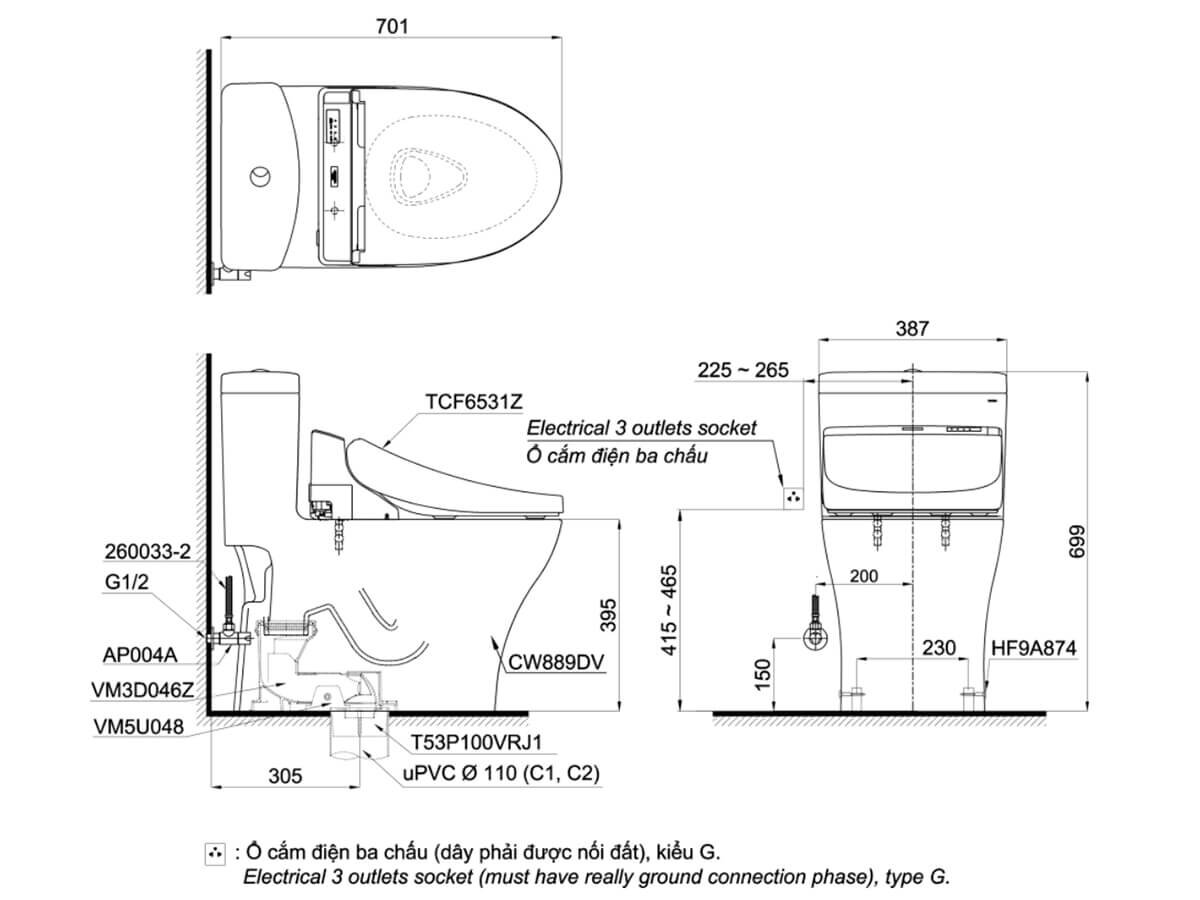Bản vẽ kỹ thuật bồn cầu nắp rửa điện tử TOTO 1 khối MS889DRW6