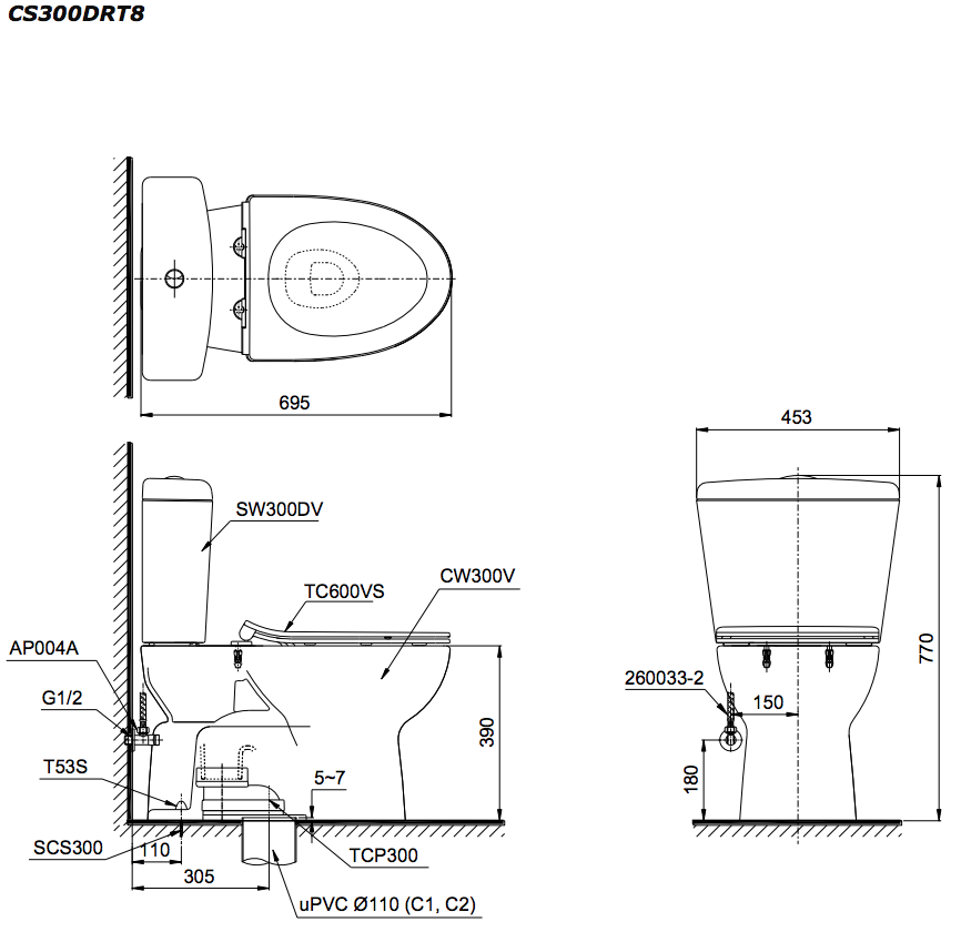 Bản vẽ kỹ thuật bồn cầu TOTO 2 khối CS300DRT8