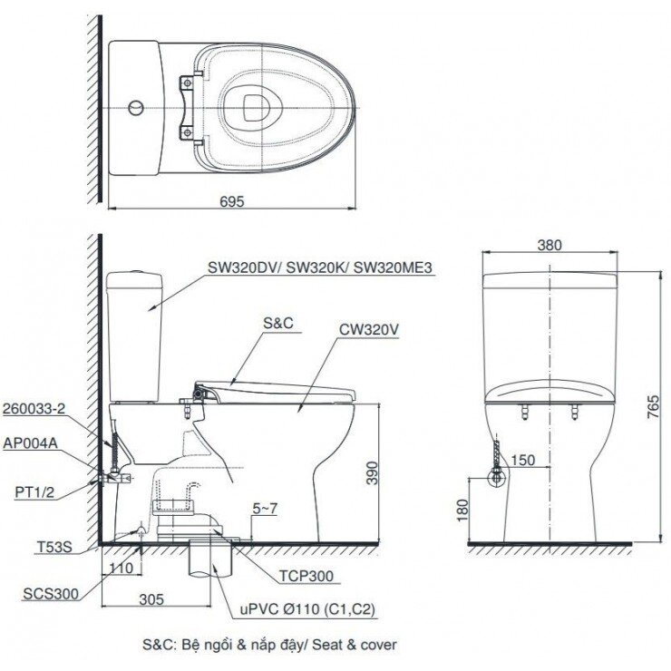 Bản vẽ kỹ thuật bồn cầu 2 khối nắp điện tử TOTO CS300DW16Y1