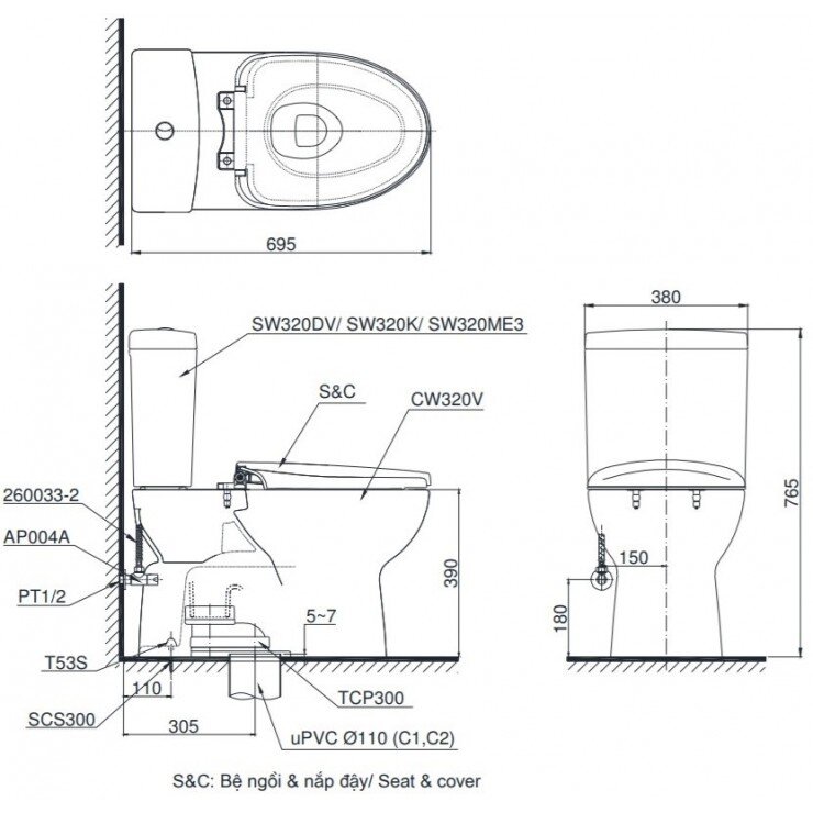 Bản vẽ kỹ thuật bồn cầu 2 khối nắp điện tử TOTO CS320DRW16