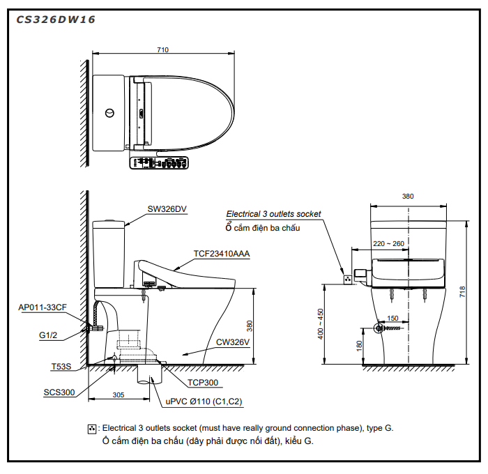 Bản vẽ kỹ thuật bồn cầu 2 khối nắp điện tử TOTO CS326DW16