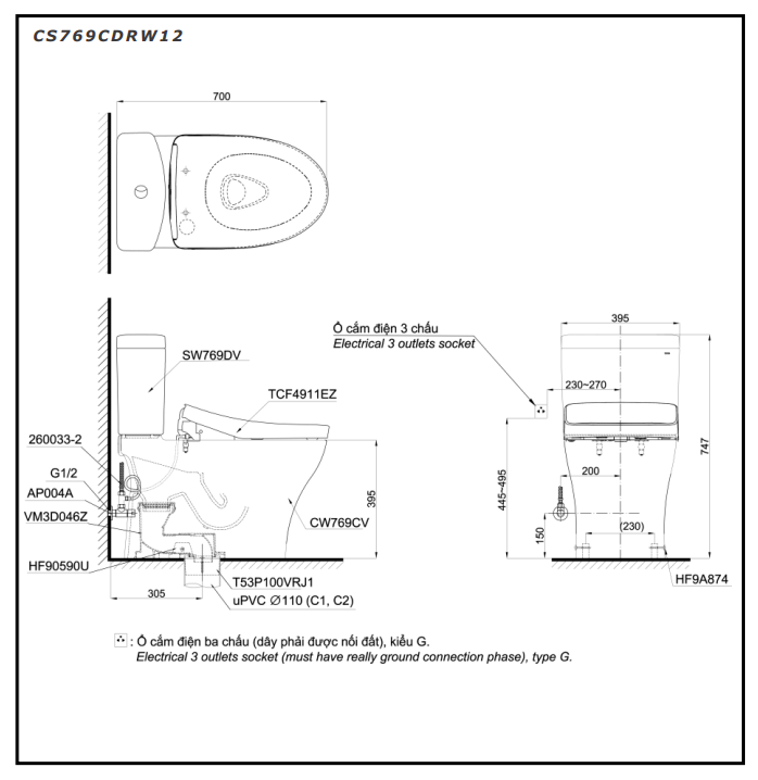 Bản vẽ kỹ thuật bồn cầu nắp rửa điện tử TOTO 2 khối CS769CDRW12