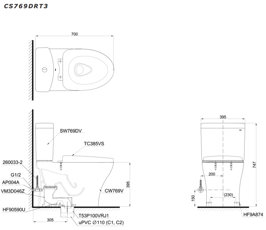 Bản vẽ kỹ thuật bồn cầu TOTO 2 khối CS769DRT3