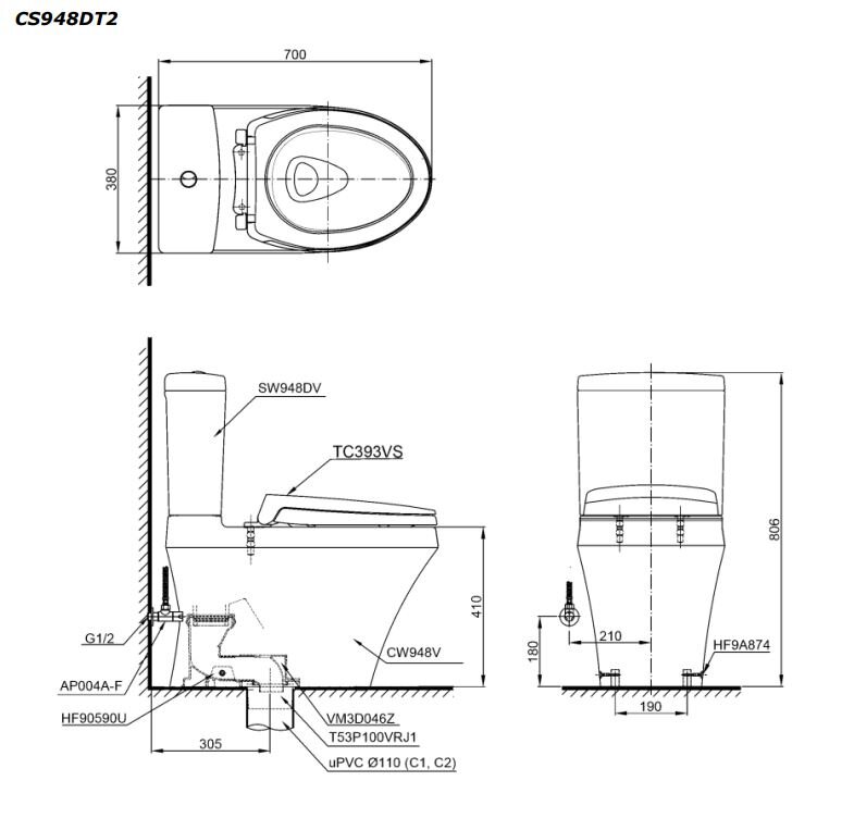 Bản vẽ kỹ thuật bồn cầu 2 khối nắp êm TOTO CS948DT2