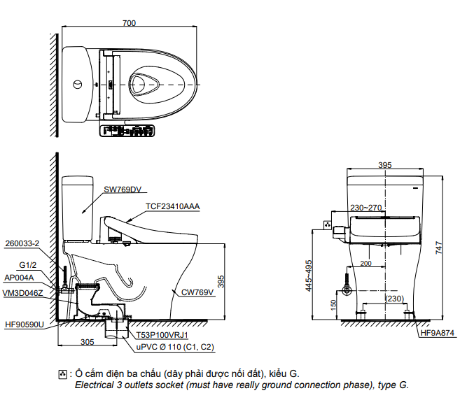 Bản vẽ kỹ thuật bồn cầu 2 khối nắp rửa điện tử WASHLET dòng C2 TOTO CS769DRW16