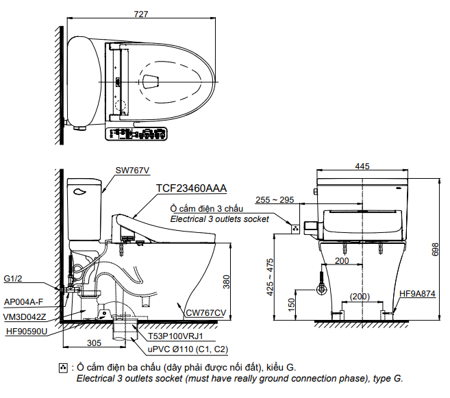 Bản vẽ kỹ thuật bồn cầu 2 khối nắp rửa điện tử WASHLET (loại giấu dây) dòng C2 TOTO CS767CRW17