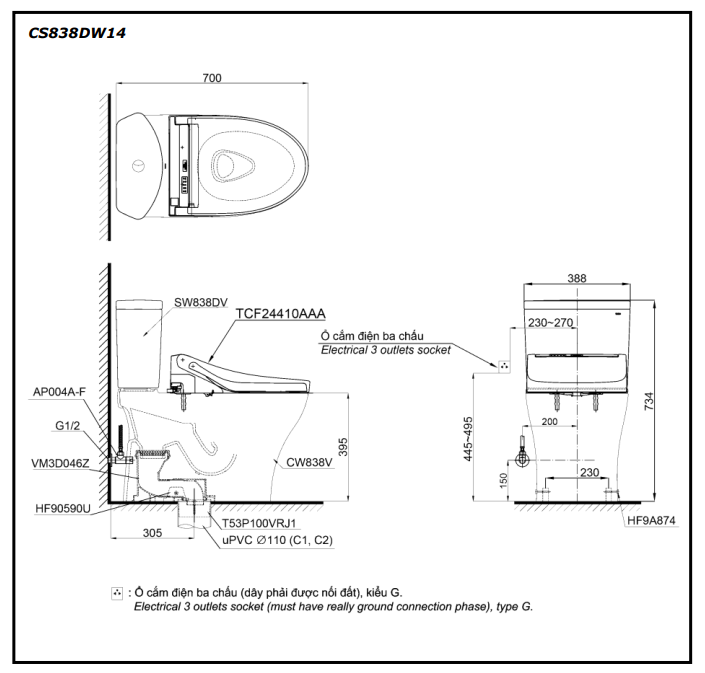 Bản vẽ kỹ thuật bồn cầu 2 khối nắp rửa điện tử C5 TOTO CS838DW14