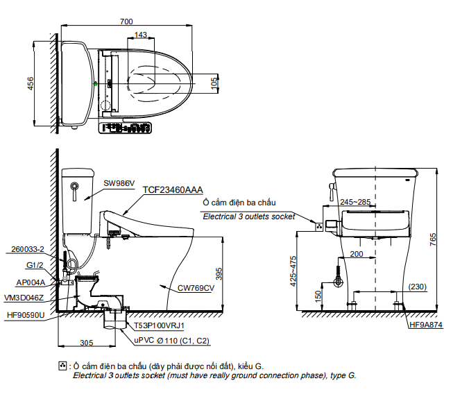 Bản vẽ kỹ thuật bồn cầu 2 khối nắp rửa điện tử WASHLET (loại giấu dây) dòng C2 TOTO CS986CGW17