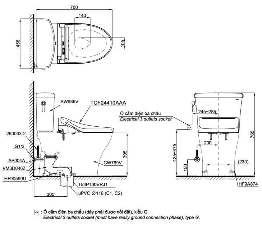 Bản vẽ kỹ thuật bồn cầu 2 khối nắp rửa điện tử C5 TOTO CS986GW14