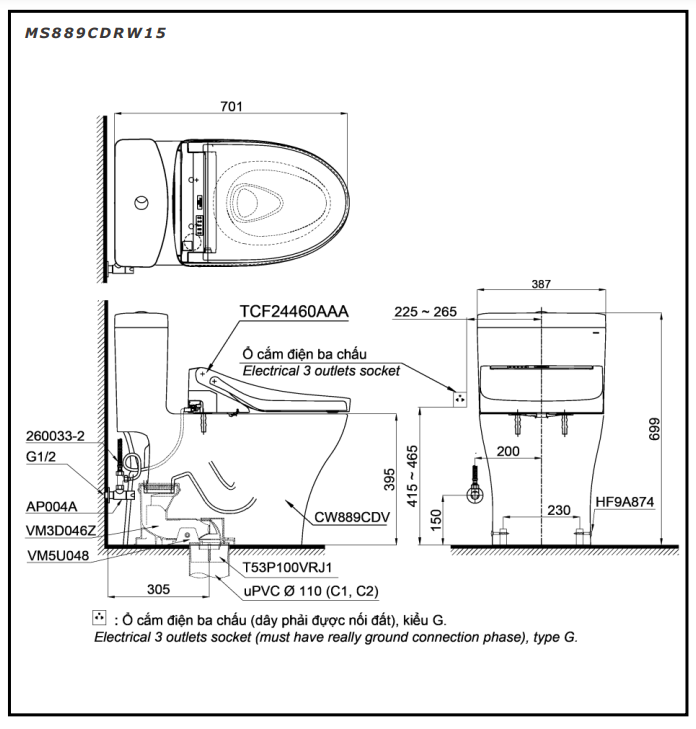 Bản vẽ kỹ thuật bồn cầu 1 khối dấu giây nắp rửa điện tử C5 TOTO MS889CDRW15