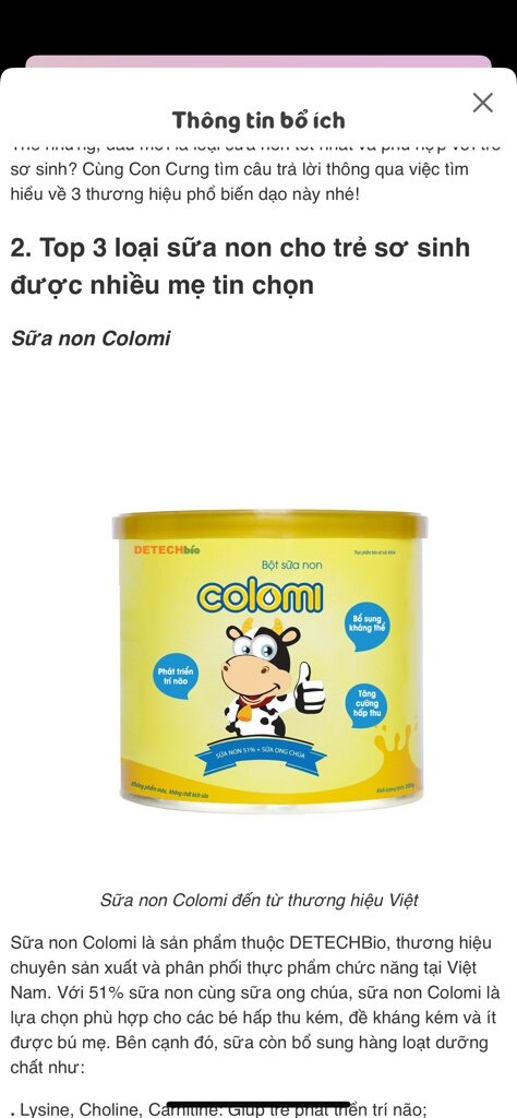 Dạ Con Cưng chào Ba Mẹ, Thực phẩm bảo vệ sức khỏe - Sữa non Colomi dùng được cho bé từ 6 tháng trở lên, Lưu ý: Trẻ dưới 1 tuổi nên hỏi ý kiến chuyên gia dinh dưỡng. Thông tin đến Ba Mẹ. Con Cưng xin cảm ơn Ba Mẹ.