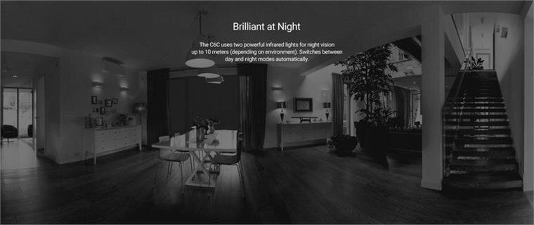 - Brilliant at Night: EZVIZ C6CN được trang bị hai đèn hồng ngoại mạnh mẽ với phạm vi lên đến 10 mét (tùy thuộc vào môi trường) - đủ lớn để bao phủ bất kỳ phòng nào. Tự động chuyển giữa chế độ ngày và đêm.