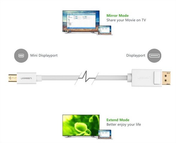 Thông số kỹ thuật: Cáp Mini DisplayPort sang Displayport Ugreen dài 3 mét 1. Tương thích với Mini Displayport 1.1 tiêu chuẩn. 2. Hỗ trợ tốc độ lên đến 8,64 Gbps.? 3. Hỗ trợ 8b / 10b truyền dữ liệu (lên đến tỷ lệ biểu tượng 2.7GHz, lên đến 4 làn xe). 4. Hỗ trợ truyền dẫn băng thông đầy đủ (2560x1600p @ 60Hz). 5. Hỗ trợ độ sâu màu sắc của 6, 8, 10, 12 và 16 bit cho mỗi thành phần. 6. Hỗ trợ DPCP (DisplayPort Content Protection).