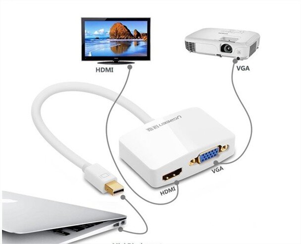 Thông số kỹ thuật : Cáp Mini Displayport to VGA+HDMI- Ugreen UG- 10427 - Cáp Mini displayport to HDMI + VGA  có 2 chipset, và hỗ trợ cả tín hiệu kỹ thuật số và analog, nhưng HDMI và VGA port không thể sử dụng cùng 1 lúc được - Cáp có chuẩn kết nối: mini Displayport   dương ra 2 cổng HDMI  và  VGA âm - Cáp Mini Displayport chuẩn 1.1a - High Speed HDMI với độ phân giải lên tới 1920 x 1080. - Cáp chuyển đổi mini Displayport to HDMI và VGA Ugreen 10427  dài khoảng 20 cm. - - Lưu ý : không chuyển tín hiệu HDMI và VGA cùng lúc ra 2 màn hình, nếu cắm ra 2 màn hình thì tín hiệu chuyển đổi sẽ ưu tiên phát ra cổng HDMI.