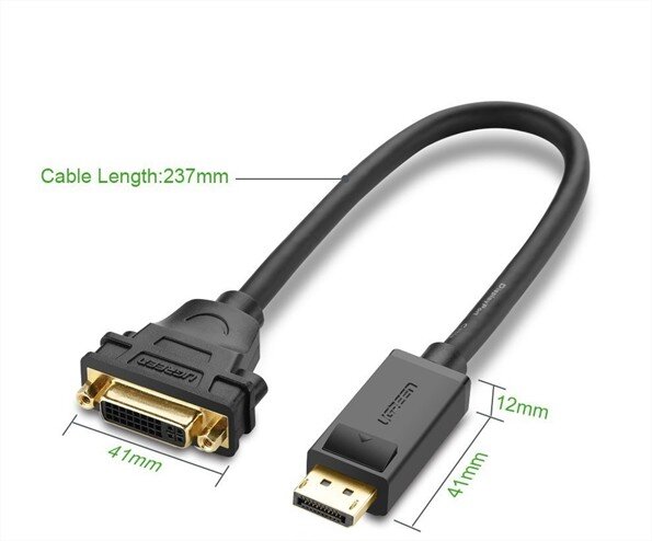 Ugreen 20405 chuyển đổi từ Displayport dương (Male) sang DVI 24+5 âm (Female) Đầu vào : Displayport Đầu ra : DVI 24+5 female . Đầu tiếp xúc cáp mạ kim loại màu vàng chống gỉ cho độ bền cao khi sử dụng Chức năng : Truyền tải video độ nét cao từ máy tính của bạn sang màn hình để xem video hoặc chơi game;  Kết nối và cấu hình màn hình của bạn cho Màn hình Mở rộng hoặc Màn hình Lớn Ugreen 20405 hỗ trợ các độ phân giải video lên đến 1920x1200 / 1080P (Full HD), màn hình hiển thị DisplayPort Ugreen với cáp DVI Dual Link HD 1080P vàng mạ với chốt để kết nối các card đồ họa /