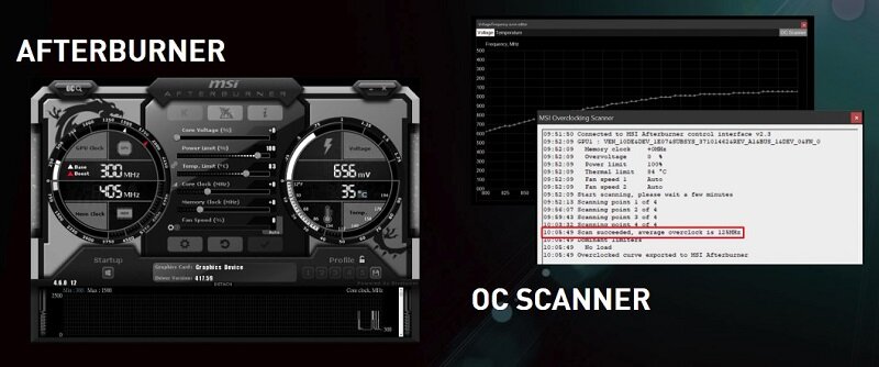 Với bộ phần mềm MSI AfterBurner, game thủ có thể theo dõi trạng thái hoạt động cũng như tùy chỉnh, ép xung card để có được hiệu năng chơi game tốt nhất. Thậm chí với tính năng OC Scanner, việc ép xung đã trở nên dễ dàng hơn bao giờ hết chỉ với 1 cú click chuột.