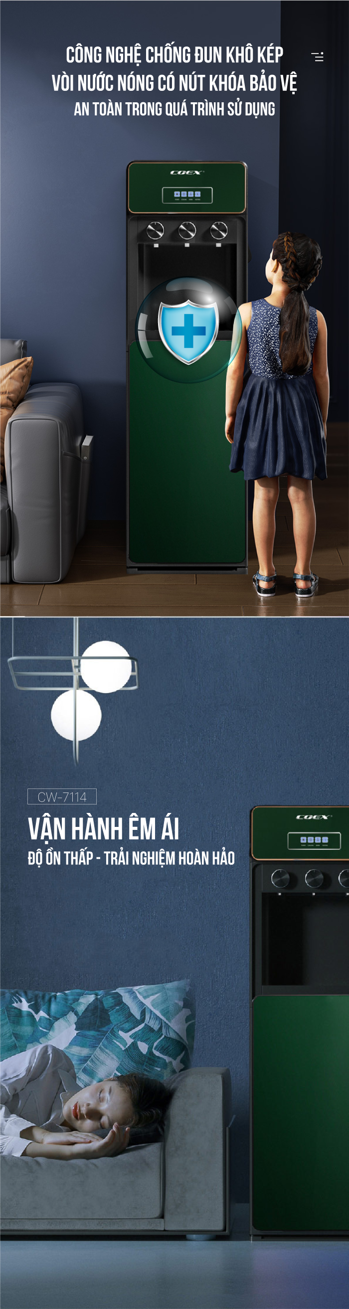 Cây nước nóng lạnh Coex CW-7114 thiết kế với màu xanh sang trọng, kiểu dáng nhỏ gọn, hiện đại, dùng đẹp trong cả không gian kiến trúc gia đình, văn phòng, nhà hàng – khách sạn, khu du lịch… Máy dùng bình chứa nước chất liệu inox 304 cao cấp không han gỉ, bền tốt, trữ nước sạch và an toàn. Thiết kế dạng bình úp giúp cho chúng ta quan sát được lượng nước còn lại được dễ dàng, chủ động thay mới bình khi cần thiết.